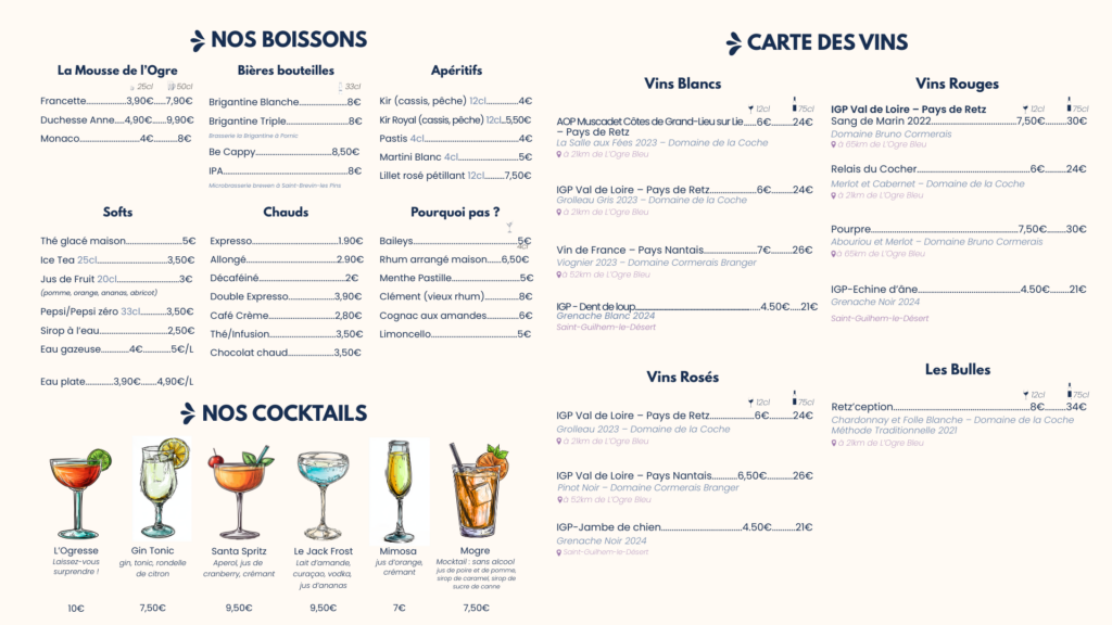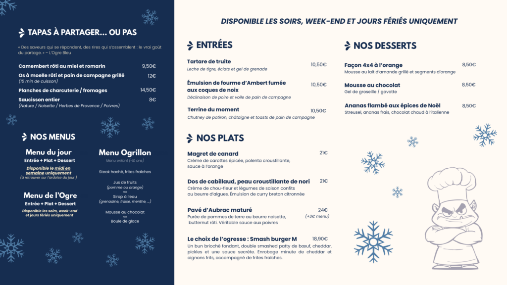 Menu de l’Ogre – 31€ : disponible les soirs, week-ends et jours fériés uniquement. Au choix parmi les plats ci-dessous